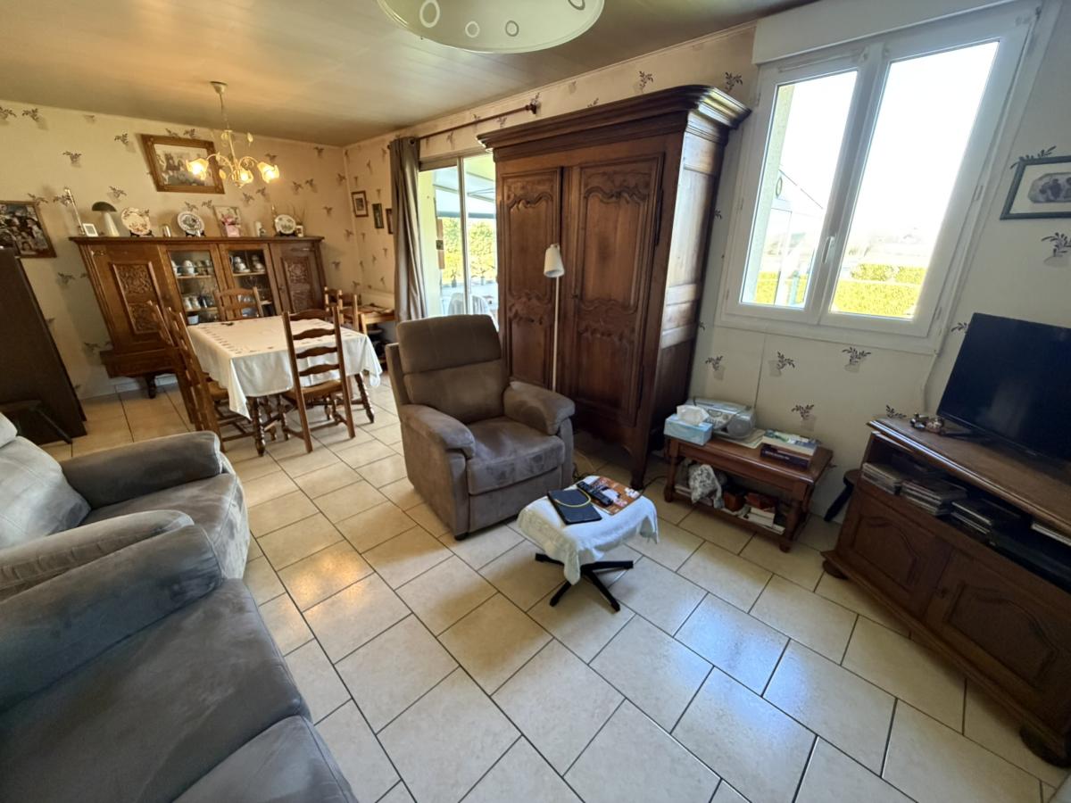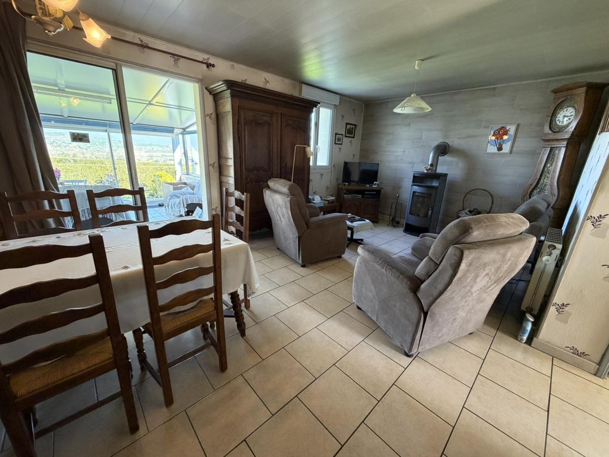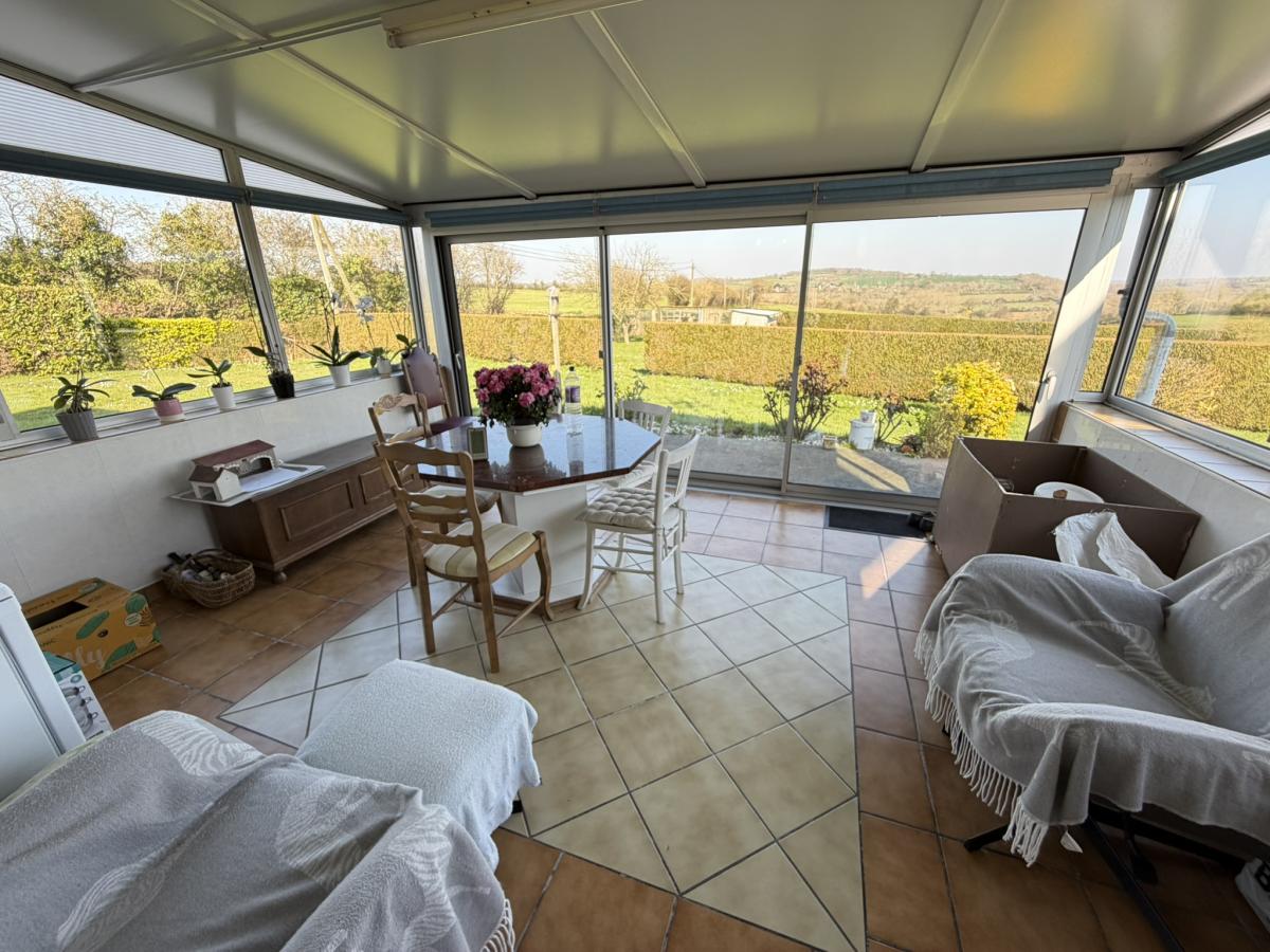 - Au rez de chaussée: petit sas, entrée, séjour avec poêle à bois, cuisine équipée, véranda, deux chambres, salle d'eau, WC.
